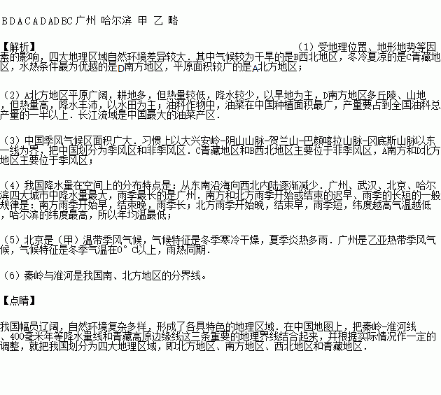 (3)根据图中季风区非季风区界线来判断,四大地理区域中,大部分位于季风区的两个区域是________,大部分位于非季风区的两个区域是________。(以上均填字母)