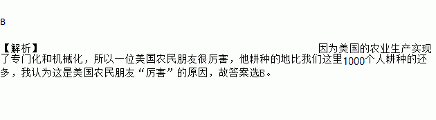 B 【解析】因为美国的农业生产实现了专门化和机械化,所以一位美国农民朋友很厉害,他耕种的地比我们这里1000个人耕种的还多,我认为这是美国农民朋友“厉害”的原因,故答案选B。