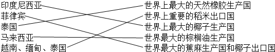 解答 解:东南亚是世界上天然橡胶、油棕、椰子等热带经济作物的重要产地.目前,泰国天然橡胶的产量、出口量均居世界首位.马来西亚是棕榈油的最大生产国.菲律宾是世界上出产蕉麻、出口椰油最多的国家.印度尼西亚是椰子的最大生产国.东南亚各国普遍种植水稻,稻米是当地居民的主要粮食,也是传统的出口产品.泰国、越南、缅甸是世界上重要的稻米出口国.
