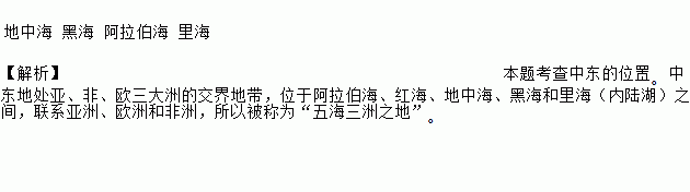 地中海 黑海 阿拉伯海 里海 【解析】本题考查中东的位置。中东地处亚、非、欧三大洲的交界地带,位于阿拉伯海、红海、地中海、黑海和里海(内陆湖)之间,联系亚洲、欧洲和非洲,所以被称为“五海三洲之地”。