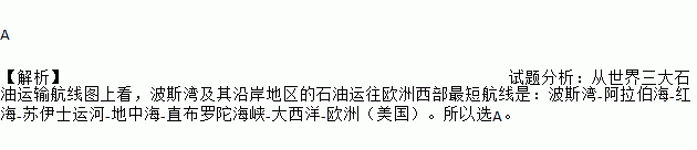 A 【解析】试题分析:从世界三大石油运输航线图上看,波斯湾及其沿岸地区的石油运往欧洲西部最短航线是:波斯湾-阿拉伯海-红海-苏伊士运河-地中海-直布罗陀海峡-大西洋-欧洲(美国)。所以选A。