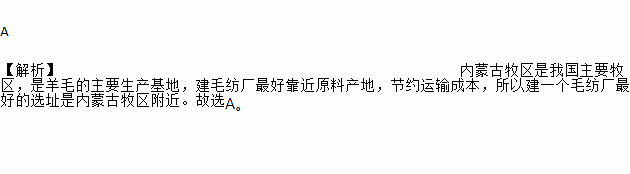 A 【解析】内蒙古牧区是我国主要牧区,是羊毛的主要生产基地,建毛纺厂最好靠近原料产地,节约运输成本,所以建一个毛纺厂最好的选址是内蒙古牧区附近。故选A。