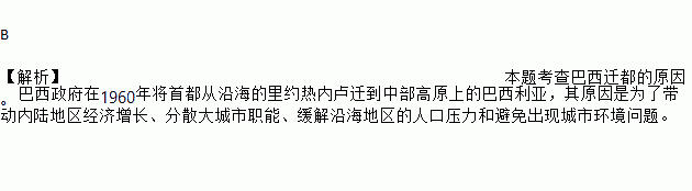 B 【解析】本题考查巴西迁都的原因。巴西政府在1960年将首都从沿海的里约热内卢迁到中部高原上的巴西利亚,其原因是为了带动内陆地区经济增长、分散大城市职能、缓解沿海地区的人口压力和避免出现城市环境问题。