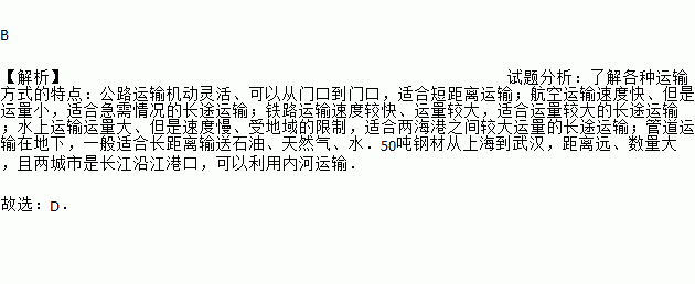 B ¡¾½âÎö¡¿ÊÔÌâ·ÖÎö£ºÁ˽â¸÷ÖÖÔËÊ䷽ʽµÄÌØµã£º¹«Â·ÔËÊä»ú¶¯Áé»î¡¢¿ÉÒÔ´ÓÃſڵ½Ãſڣ¬Êʺ϶̾àÀëÔËÊ䣻º½¿ÕÔËÊäËٶȿ졢µ«ÊÇÔËÁ¿Ð¡£¬Êʺϼ±ÐèÇé¿öµÄ³¤Í¾ÔËÊ䣻Ìú·ÔËÊäËٶȽϿ졢ÔËÁ¿½Ï´ó£¬ÊʺÏÔËÁ¿½Ï´óµÄ³¤Í¾ÔËÊ䣻ˮÉÏÔËÊäÔËÁ¿´ó¡¢µ«ÊÇËÙ¶ÈÂý¡¢ÊܵØÓòµÄÏÞÖÆ£¬ÊʺÏÁ½º£¸ÛÖ®¼ä½Ï´óÔËÁ¿µÄ³¤Í¾ÔËÊ䣻¹ÜµÀÔËÊäÔÚµØÏ£¬Ò»°ãÊʺϳ¤¾àÀëÊäËÍʯÓÍ¡¢ÌìÈ»Æø¡¢Ë®£®50¶Ö¸Ö²Ä´ÓÉϺ£µ½Î人£¬¾àÀëÔ¶¡¢ÊýÁ¿´ó£¬ÇÒÁ½³ÇÊÐÊdz¤½Ñؽ¸Û¿Ú£¬...