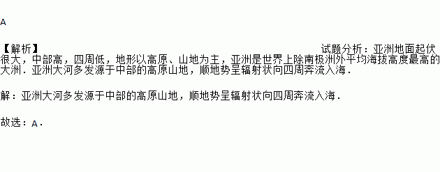 A ¡¾½âÎö¡¿ÊÔÌâ·ÖÎö£ºÑÇÖÞµØÃæÆð·üºÜ´ó£¬Öв¿¸ß£¬ËÄÖܵͣ¬µØÐÎÒÔ¸ßÔ¡¢É½µØÎªÖ÷£¬ÑÇÖÞÊÇÊÀ½çÉϳýÄϼ«ÖÞÍâÆ½¾ùº£°Î¸ß¶È×î¸ßµÄ´óÖÞ£®ÑÇÖÞ´óºÓ¶à·¢Ô´ÓÚÖв¿µÄ¸ßÔɽµØ£¬Ë³µØÊƳʷøÉä×´ÏòËÄÖܱ¼Á÷È뺣£® ¡¾½âÎö¡¿ ÑÇÖÞ´óºÓ¶à·¢Ô´ÓÚÖв¿µÄ¸ßÔɽµØ£¬Ë³µØÊƳʷøÉä×´ÏòËÄÖܱ¼Á÷È뺣£® ¹ÊÑ¡£ºA£®