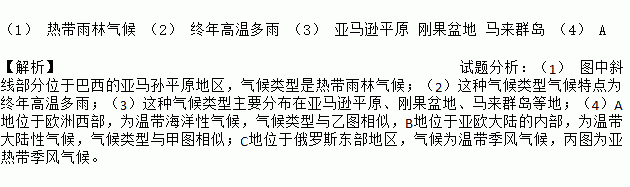 £¨1£© ÈÈ´øÓêÁÖÆøºò £¨2£© ÖÕÄê¸ßζàÓê £¨3£© ÑÇÂíÑ·Æ½Ô ¸Õ¹ûÅèµØ ÂíÀ´Èºµº £¨4£© A ¡¾½âÎö¡¿ÊÔÌâ·ÖÎö£º£¨1£© ͼÖÐбÏß²¿·ÖλÓÚ°ÍÎ÷µÄÑÇÂíËïÆ½ÔµØÇø£¬ÆøºòÀàÐÍÊÇÈÈ´øÓêÁÖÆøºò£»£¨2£©ÕâÖÖÆøºòÀàÐÍÆøºòÌØµãΪÖÕÄê¸ßζàÓꣻ£¨3£©ÕâÖÖÆøºòÀàÐÍÖ÷Òª·Ö²¼ÔÚÑÇÂíѷƽԡ¢¸Õ¹ûÅèµØ¡¢ÂíÀ´ÈºµºµÈµØ£»£¨4£©AµØÎ»ÓÚÅ·ÖÞÎ÷²¿£¬ÎªÎ´øº£ÑóÐÔÆøºò£¬ÆøºòÀàÐÍÓëÒÒͼÏàËÆ£¬BµØÎ»ÓÚÑÇÅ·´ó½µÄÄÚ²¿£¬ÎªÎ´ø´ó½ÐÔÆøºò£¬...