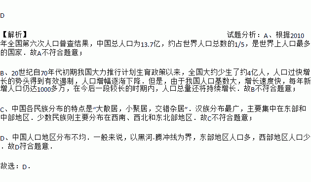 D 【解析】试题分析:A、根据2010年全国第六次人口普查结果,中国总人口为13.7亿,约占世界人口总数的1/5,是世界上人口最多的国家.故A不符合题意; B、20世纪自70年代初期我国大力推行计划生育政策以来,全国大约少生了约4亿人,人口过快增长的势头得到有效遏制,人口增幅逐渐下降.但是,由于我国人口基数大,增长速度快,每年新增人口仍达1000多万,在今后一段较长的时期内,人口总量还...