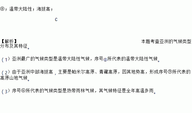 ⑧;温带大陆性;海拔高;C 【解析】 本题考查亚洲的气候类型分布及其特征。 (1)亚洲最广的气候类型是温带大陆性气候,序号⑧所代表的温带大陆性气候。 (2)由于亚洲中部海拔高,主要是帕米尔高原、青藏高原,因其地势高,形成序号⑨所代表的高原山地气候。 (3)序号⑥所代表的气候类型是热带雨林气候,其气候特征是全年高温多雨。