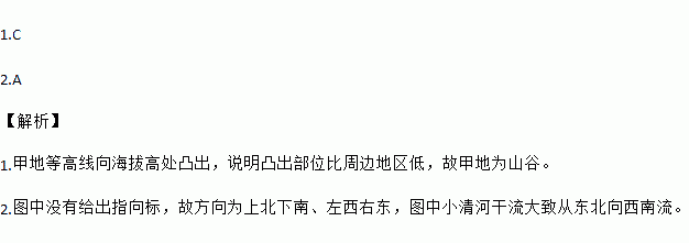 1.C 2.A 【解析】 1.甲地等高线向海拔高处凸出,说明凸出部位比周边地区低,故甲地为山谷。 2.图中没有给出指向标,故方向为上北下南、左西右东,图中小清河干流大致从东北向西南流。