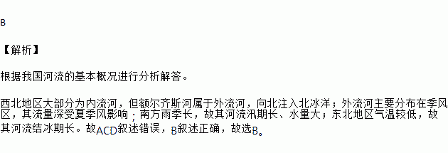 C. 南方河流汛期短、水量小 D. 东北地区的河流结冰期短