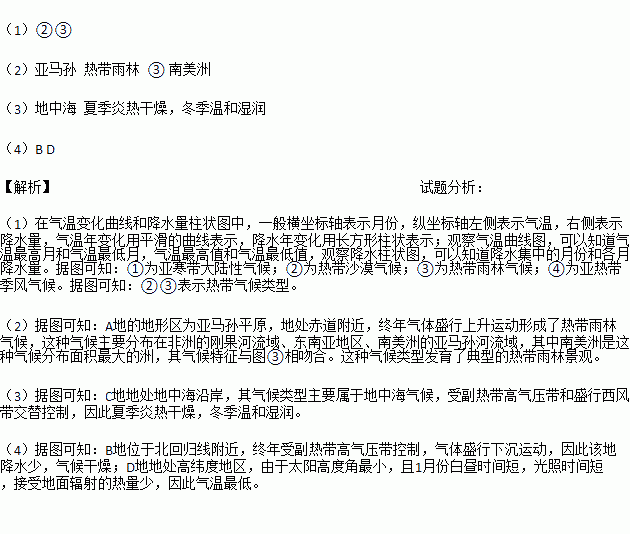 (1)图中①②③④四幅气候图中,表示热带气候类型的是____________ 。