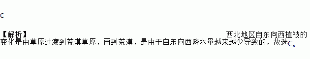 C 【解析】西北地区自东向西植被的变化是由草原过渡到荒漠草原,再到荒漠,是由于自东向西降水量越来越少导致的,故选C。