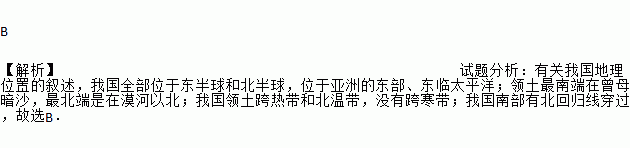 B 【解析】试题分析:有关我国地理位置的叙述,我国全部位于东半球和北半球,位于亚洲的东部、东临太平洋;领土最南端在曾母暗沙,最北端是在漠河以北;我国领土跨热带和北温带,没有跨寒带;我国南部有北回归线穿过,故选B.