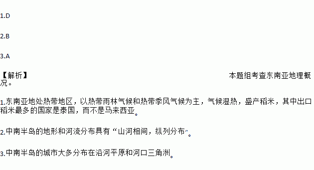 1.D 2.B 3.A 【解析】本题组考查东南亚地理概况。 1.东南亚地处热带地区,以热带雨林气候和热带季风气候为主,气候湿热,盛产稻米,其中出口稻米最多的国家是泰国,而不是马来西亚。 2.中南半岛的地形和河流分布具有“山河相间,纵列分布”。 3.中南半岛的城市大多分布在沿河平原和河口三角洲。