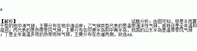 C. 丙——热带季风气候——主要分布在印度半岛、我国的山东半岛