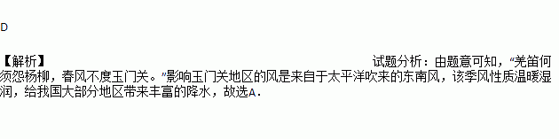 唐代诗人王之涣诗曰:“羌笛何须怨杨柳,春风不度玉门关。”李白却说:“长风几万里,吹度玉门关”。影响玉门关地区的风是( )