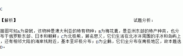 如图为某环球旅行者拍摄的四幅动物照片,其中拍摄于北极地区的是( )