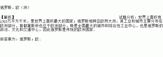 俄罗斯,欧(洲) 【解析】试题分析:世界上面积有1707万平方千米,是世界上面积最大的国家;俄罗斯地跨亚欧两大洲,其工业和城市主要分布在欧洲部分,首都莫斯科也位于欧洲部分,既是全国最大的城市和综合性工业中心,也是俄罗斯的政治、文化和交通中心,因此俄罗斯是传统的欧洲国家. 故答案为:俄罗斯;欧.