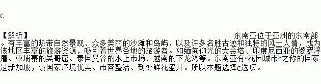 C ¡¾½âÎö¡¿¶«ÄÏÑÇλÓÚÑÇÖ޵Ķ«Äϲ¿¡£ÓзḻµÄÈÈ´ø×ÔÈ»¾°¹Û¡¢ÖÚ¶àÃÀÀöµÄɳ̲ºÍµºÓ죬ÒÔ¼°Ðí¶àÃûʤ¹Å¼£ºÍ¶ÀÌØµÄ·çÍÁÈËÇ飬³ÉΪ¸ÃµØÇø·á¸»µÄÂÃÓÎ×ÊÔ´£¬ÎüÒý×ÅÊÀ½ç¸÷µØµÄÂÃÓÎÕß¡£ÈçÃåµéÑö¹âµÄ´ó½ðËþ¡¢Ó¡¶ÈÄáÎ÷ÑÇµÄÆÅÂÞ¸¡ÍÀ¡¢¼íÆÒÕ¯µÄÎâ¸ç¿ß¡¢Ì©¹úÂü¹ÈµÄË®ÉÏÊг¡¡¢Ô½ÄϵÄÏÂÁúÍåµÈ¡£¶«ÄÏÑÇÓС°»¨Ô°³ÇÊС±Ö®³ÆµÄ¹ú¼ÒÊÇÐÂ¼ÓÆÂ£¬¸Ã¹ú¼Ò»·¾³ÓÅÃÀ¡¢ÊÐÈÝÕû½à¡¢µ½´¦ÏÊ»¨Ê¢¿ª¡£ËùÒÔ±¾ÌâÑ¡ÔñCÑ¡Ïî¡£
