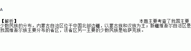 A 【解析】本题主要考查了我国主要少数民族的分布。内蒙古自治区位于中国北部边疆,以蒙古族和汉族为主;新疆维吾尔自治区是我国维吾尔族主要分布的省区,该省区另一主要的少数民族是哈萨克族。