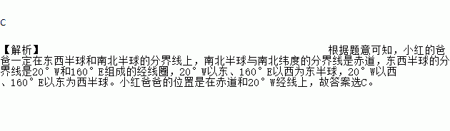 小红的爸爸是一名海军,一天他打电话告诉小红:“我现在的位置北边是北半球,南边是南半球,东边是东半球,西边是西半球。”小红爸爸的位置是( )