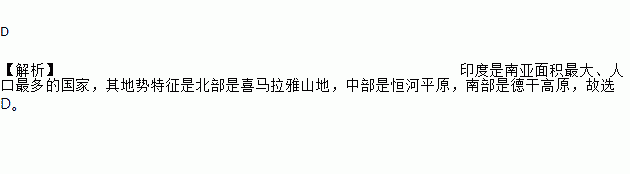 D 【解析】印度是南亚面积最大、人口最多的国家,其地势特征是北部是喜马拉雅山地,中部是恒河平原,南部是德干高原,故选D。