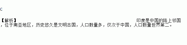 C 【解析】印度是中国的陆上邻国,位于南亚地区,历史悠久是文明古国,人口数量多,仅次于中国,人口数量世界第二。