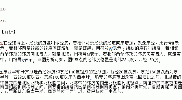1.B 2.B ¡¾½âÎö¡¿ 1.ÔÚ¾Î³ÍøÉÏ£¬¾ÏߵĶÈÊý½Ð×ö¾¶È£¬ÈôÏàÁÚÁ½Ìõ¾Ïߵľ¶ÈÏò¶«Ôö¼Ó£¬¾ÍÊǶ«¾£¬Ó÷ûºÅE±íʾ£¬ÈôÏàÁÚÁ½Ìõ¾Ïߵľ¶ÈÏòÎ÷Ôö¼Ó£¬¾ÍÊÇÎ÷¾£¬Ó÷ûºÅW±íʾ£»Î³ÏߵĶÈÊý½Ðγ¶È£¬ÈôÏàÁÚÁ½ÌõγÏßµÄγ¶ÈÏò±±Ôö´ó£¬¾ÍÊDZ±Î³£¬Ó÷ûºÅN±íʾ£¬ÈôÏàÁÚÁ½ÌõγÏßµÄγ¶ÈÏòÄÏÔö´ó£¬¾ÍÊÇÄÏ㣬Ó÷ûºÅS±íʾ¡£¶Áͼ·ÖÎö¿ÉÖª£¬Í¼ÖÐMµãµÄ¾Î³¶ÈλÖÃÊÇÄÏγ23.5¶È£¬Î÷¾150¶È¡£ 2.¶«Î÷°ëÇò...