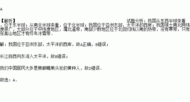 C. 长江自东向西注入海洋 D. 我们中国居民都是黑眼睛黑头发的黑种人
