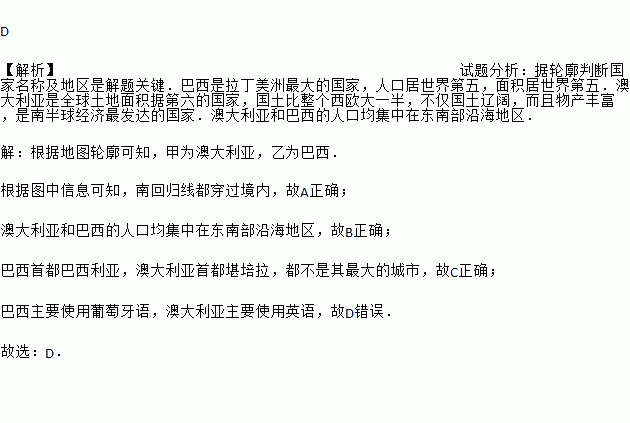 D ¡¾½âÎö¡¿ÊÔÌâ·ÖÎö£º¾ÝÂÖÀªÅжϹú¼ÒÃû³Æ¼°µØÇøÊǽâÌâ¹Ø¼ü£®°ÍÎ÷ÊÇÀ¶¡ÃÀÖÞ×î´óµÄ¹ú¼Ò£¬È˿ھÓÊÀ½çµÚÎå£¬Ãæ»ý¾ÓÊÀ½çµÚÎ壮°Ä´óÀûÑÇÊÇÈ«ÇòÍÁµØÃæ»ý¾ÝµÚÁùµÄ¹ú¼Ò£¬¹úÍÁ±ÈÕû¸öÎ÷Å·´óÒ»°ë£¬²»½ö¹úÍÁÁÉÀ«£¬¶øÇÒÎï²ú·á¸»£¬ÊÇÄϰëÇò¾¼Ã×î·¢´ïµÄ¹ú¼Ò£®°Ä´óÀûÑǺͰÍÎ÷µÄÈ˿ھù¼¯ÖÐÔÚ¶«Äϲ¿Ñغ£µØÇø£® ¡¾½âÎö¡¿ ¸ù¾ÝµØÍ¼ÂÖÀª¿ÉÖª£¬¼×Ϊ°Ä´óÀûÑÇ£¬ÒÒΪ°ÍÎ÷£® ¸ù¾ÝͼÖÐÐÅÏ¢¿ÉÖª£¬ÄϻعéÏß¶¼´©¹ý¾³ÄÚ£¬¹ÊAÕýÈ·£» ...