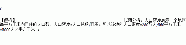 某地区人口数为280万人,土地面积为560平方千米,则该地区的人口密度为( )