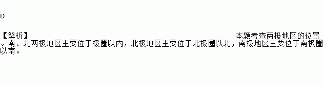 D 【解析】本题考查两极地区的位置。南、北两极地区主要位于极圈以内,北极地区主要位于北极圈以北,南极地区主要位于南极圈以南。