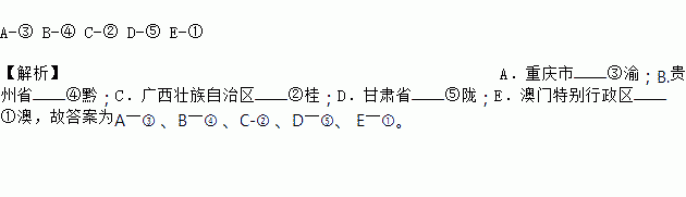 A-③ B-④ C-② D-⑤ E-① 【解析】A.重庆市——③渝;B.贵州省——④黔;C.广西壮族自治区——②桂;D.甘肃省——⑤陇;E.澳门特别行政区——①澳,故答案为A一③ 、B一④ 、C-② 、D一⑤、 E一①。