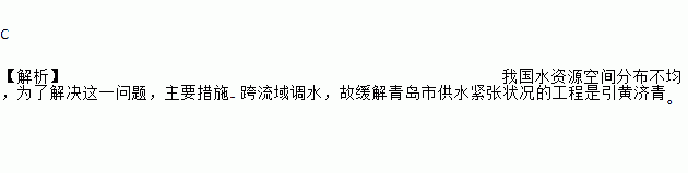 C 【解析】我国水资源空间分布不均,为了解决这一问题,主要措施- 跨流域调水,故缓解青岛市供水紧张状况的工程是引黄济青。