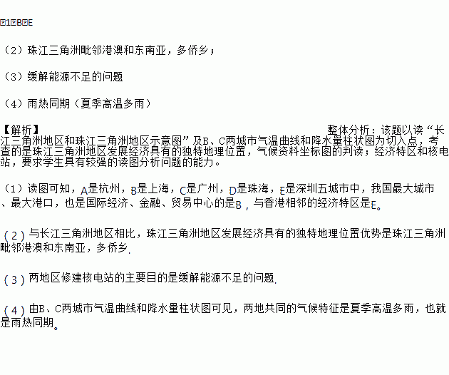 (1)B;E (2)珠江三角洲毗邻港澳和东南亚,多侨乡; (3)缓解能源不足的问题 (4)雨热同期(夏季高温多雨) 【解析】整体分析:该题以读“长江三角洲地区和珠江三角洲地区示意图”及B、C两城市气温曲线和降水量柱状图为切入点,考查的是珠江三角洲地区发展经济具有的独特地理位置,气候资料坐标图的判读;经济特区和核电站,要求学生具有较强的读图分析问题的能力。 (1)读图可...