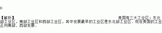 D 【解析】美国有三大工业区:东北部工业区,南部工业区和西部工业区,其中发展最早的工业区是东北部工业区.现在美国的工业正向南部、西部发展.