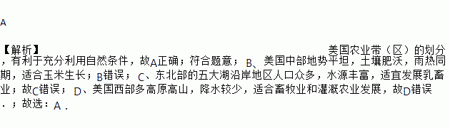 A 【解析】美国农业带(区)的划分,有利于充分利用自然条件,故A正确;符合题意; B、美国中部地势平坦,土壤肥沃,雨热同期,适合玉米生长;B错误; C、东北部的五大湖沿岸地区人口众多,水源丰富,适宜发展乳畜业;故C错误; D、美国西部多高原高山,降水较少,适合畜牧业和灌溉农业发展,故D错误.;故选:A.