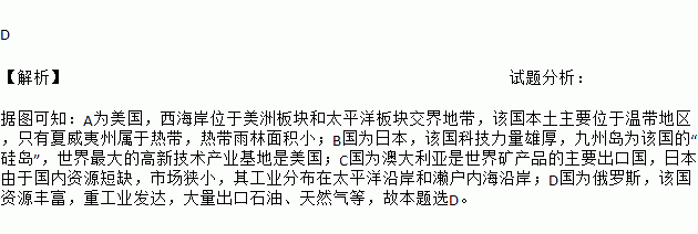 D 【解析】试题分析: 据图可知:A为美国,西海岸位于美洲板块和太平洋板块交界地带,该国本土主要位于温带地区,只有夏威夷州属于热带,热带雨林面积小;B国为日本,该国科技力量雄厚,九州岛为该国的“硅岛”,世界最大的高新技术产业基地是美国;C国为澳大利亚是世界矿产品的主要出口国,日本由于国内资源短缺,市场狭小,其工业分布在太平洋沿岸和濑户内海沿岸;D国为俄罗斯,该国资源丰富,重工业发达,大...