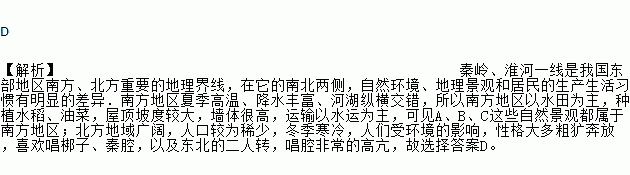 D 【解析】秦岭、淮河一线是我国东部地区南方、北方重要的地理界线,在它的南北两侧,自然环境、地理景观和居民的生产生活习惯有明显的差异.南方地区夏季高温、降水丰富、河湖纵横交错,所以南方地区以水田为主,种植水稻、油菜,屋顶坡度较大,墙体很高,运输以水运为主,可见A、B、C这些自然景观都属于南方地区;北方地域广阔,人口较为稀少,冬季寒冷,人们受环境的影响,性格大多粗犷奔放,喜欢唱梆子、秦腔,以及...