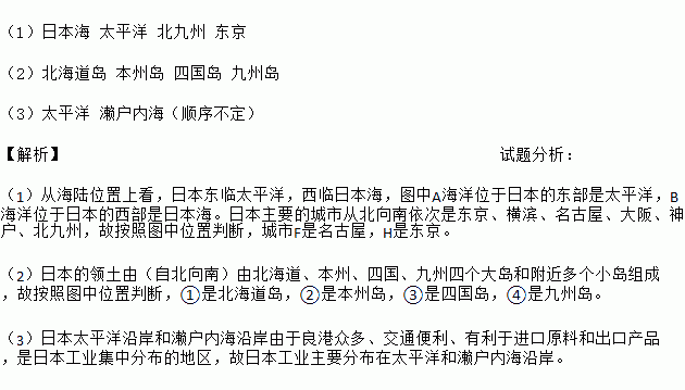 (1)日本海 太平洋 北九州 东京 (2)北海道岛 本州岛 四国岛 九州岛 (3)太平洋 濑户内海(顺序不定) 【解析】试题分析: (1)从海陆位置上看,日本东临太平洋,西临日本海,图中A海洋位于日本的东部是太平洋,B海洋位于日本的西部是日本海。日本主要的城市从北向南依次是东京、横滨、名古屋、大阪、神户、北九州,故按照图中位置判断,城市F是名古屋,H是东京。 (2)日...