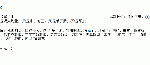 C 【解析】试题分析:读图可得,①是澳大利亚,②是中东地区,③是俄罗斯,④是印度. 【解析】 我国的陆上国界漫长,达2万多千米,接壤的国家有14个,分别是:朝鲜、蒙古、俄罗斯、哈萨克斯坦、吉尔吉斯斯坦、塔吉克斯坦、阿富汗、巴基斯坦、印度、尼泊尔、不丹、缅甸、老挝、越南,故C符合题意. 故选:C.
