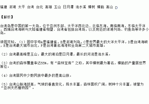 (1)图中字母代表的地理事物名称是:A._______省;B._______列岛;C._______ 洋;D._______海峡;E._______是台湾最大城市;F._______是台湾著名海港和全岛第二大城市