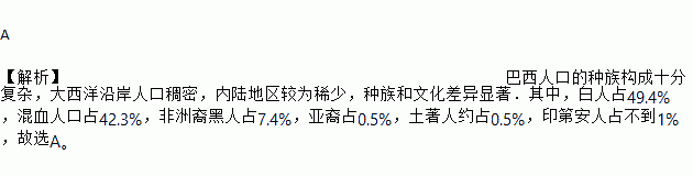 A 【解析】巴西人口的种族构成十分复杂,大西洋沿岸人口稠密,内陆地区较为稀少,种族和文化差异显著.其中,白人占49.4%,混血人口占42.3%,非洲裔黑人占7.4%,亚裔占0.5%,土著人约占0.5%,印第安人占不到1%,故选A。
