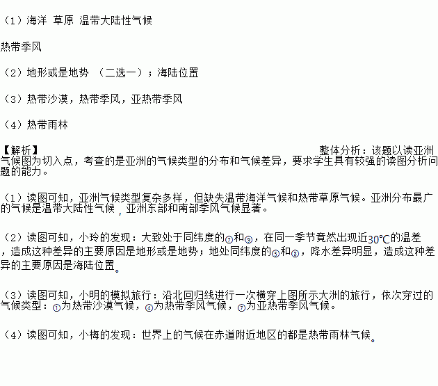 (1)海洋 草原 温带大陆性气候 热带季风 (2)地形或是地势 (二选一);海陆位置 (3)热带沙漠,热带季风,亚热带季风 (4)热带雨林 【解析】整体分析:该题以读亚洲气候图为切入点,考查的是亚洲的气候类型的分布和气候差异,要求学生具有较强的读图分析问题的能力。 (1)读图可知,亚洲气候类型复杂多样,但缺失温带海洋气候和热带草原气候。亚洲分布最广的气候是温带大...