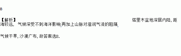B 【解析】塔里木盆地深居内陆,距海较远, 气候深受不到海洋影响,再加上山脉对湿润气流的阻隔, 气候干旱,沙漠广布,故答案选B.