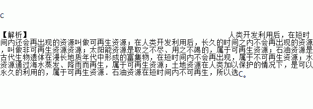 C 【解析】人类开发利用后,在短时间内还会再出现的资源叫做可再生资源;在人类开发利用后,长久的时间之内不会再出现的资源,叫做非可再生资源资源;太阳能资源是取之不尽、用之不竭的,属于可再生资源;石油资源是古代生物遗体在漫长地质年代中形成的富集物,在短时间内不会再出现,属于不可再生资源;水资源通过海水蒸发、降雨而再生,属于可再生资源;土地资源在人类加以保护的情况下,是可以永久的利用的,属于可再生...