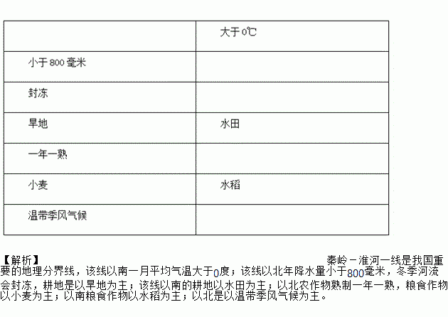 “秦岭—淮河”一线是我国东中部重要的地理界限。根据所学知识完成下表。