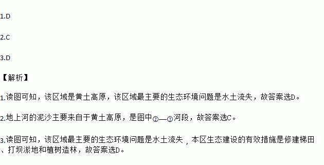 1.D 2.C 3.D ¡¾½âÎö¡¿ 1.¶Áͼ¿ÉÖª£¬¸ÃÇøÓòÊÇ»ÆÍÁ¸ßÔ£¬¸ÃÇøÓò×îÖ÷ÒªµÄÉú̬»·¾³ÎÊÌâÊÇË®ÍÁÁ÷ʧ£¬¹Ê´ð°¸Ñ¡D¡£ 2.µØÉϺӵÄÄàɳÖ÷ÒªÀ´×ÔÓÚ»ÆÍÁ¸ßÔ£¬ÊÇͼÖТڡª¢ÛºÓ¶Î£¬¹Ê´ð°¸Ñ¡C¡£ 3.¶Áͼ¿ÉÖª£¬¸ÃÇøÓò×îÖ÷ÒªµÄÉú̬»·¾³ÎÊÌâÊÇË®ÍÁÁ÷ʧ£¬±¾ÇøÉú̬½¨ÉèµÄÓÐЧ´ëÊ©ÊÇÐÞ½¨ÌÝÌï¡¢´ò°ÓÓٵغÍÖ²Ê÷ÔìÁÖ£¬¹Ê´ð°¸Ñ¡D¡£