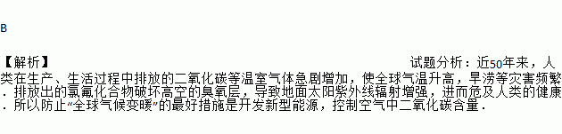 B 【解析】试题分析:近50年来,人类在生产、生活过程中排放的二氧化碳等温室气体急剧增加,使全球气温升高,旱涝等灾害频繁.排放出的氯氟化合物破坏高空的臭氧层,导致地面太阳紫外线辐射增强,进而危及人类的健康.所以防止“全球气候变暖”的最好措施是开发新型能源,控制空气中二氧化碳含量.