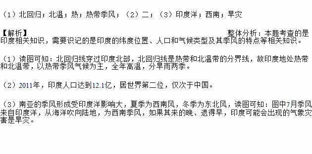 (1)北回归;北温;热;热带季风;(2)二;(3)印度洋;西南;旱灾 【解析】整体分析:本题考查的是印度相关知识,需要识记的是印度的纬度位置、人口和气候类型及其季风的特点等相关知识。 (1)读图可知:北回归线穿过印度北部,北回归线是热带和北温带的分界线,故印度地处热带和北温带,以热带季风气候为主,全年高温,分旱雨两季。 (2)2011年,印度人口达到12.1亿,居世界第二位,仅次...